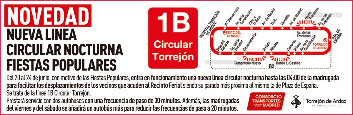 Este año, como novedad, prestará servicio una nueva línea circular nocturna durante la celebración de las Fiestas Populares. Así, hasta mañana 24 de junio, con motivo de las Fiestas Populares, entra en funcionamiento una nueva línea circular nocturna hasta las 04:00 horas de la madrugada para facilitar el desplazamiento de los vecinos que acuden al Recinto Ferial siendo su parada más próxima al mismo la de Plaza de España. Se trata de la línea 1B Circular Torrejón. Prestará servicio con dos autobuses con una frecuencia de paso de 30 minutos. Además, las madrugadas del viernes y del sábado se añadirá un autobús más para reducir las frecuencias de paso a 20 minutos.